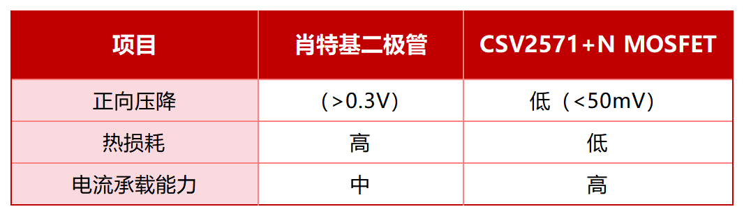 為了盡可能接近理想二極管的正向?qū)ǚ聪蚪刂构δ埽覀儾捎昧艘环N模擬真實(shí)理想二極管行為的電路實(shí)現(xiàn),它通常由一個(gè)控制器芯片(如 CSV2571)配合一個(gè)外接N溝道 MOSFET構(gòu)成,如圖2(b)所示。其核心優(yōu)勢是: